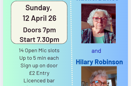 Join us for a spoken word open mic on 12th April. Our guest performers will be ‘the poetry twins’ – Rachel Davies and Hilary Robinson. They are both accomplished poets and their poetry is widely published in journals, anthologies and online. They will be reading from their joint collection of poems ‘An Altogether Different Place’,…